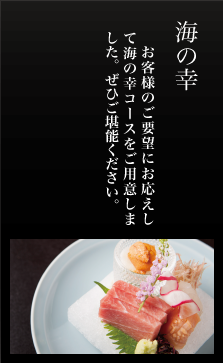 こだわりの食材を丹精込めて調理いたします。 川魚料理と鮮度にこだわった旬の味覚、 海鮮づくしのコースもご用意しました。